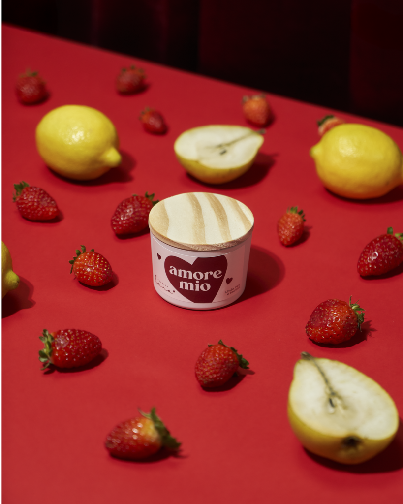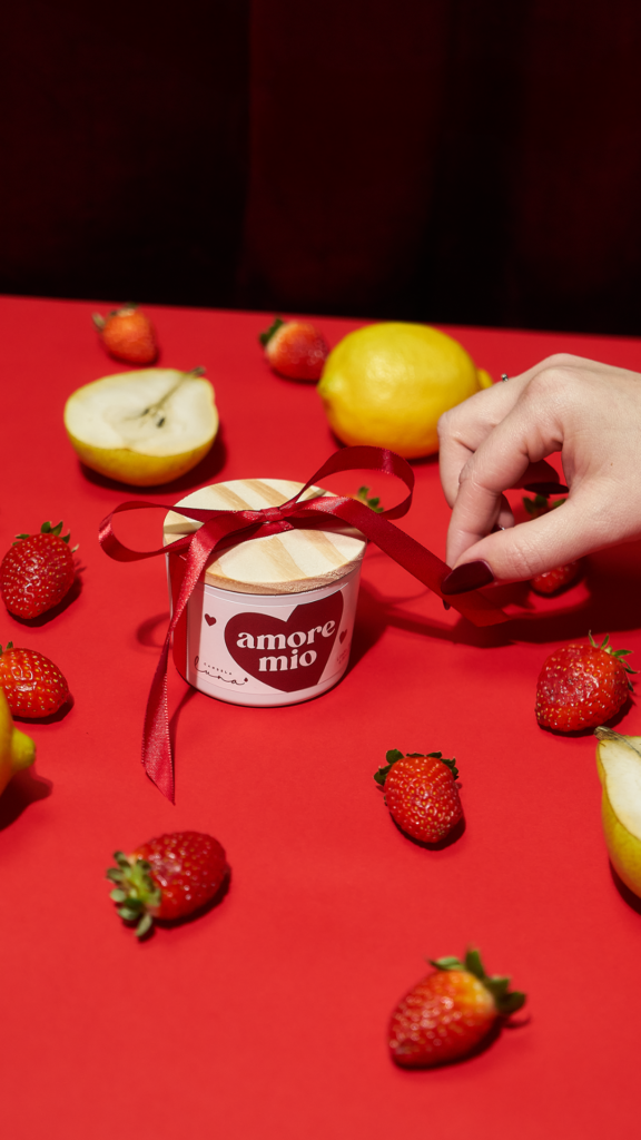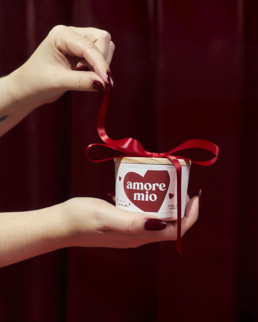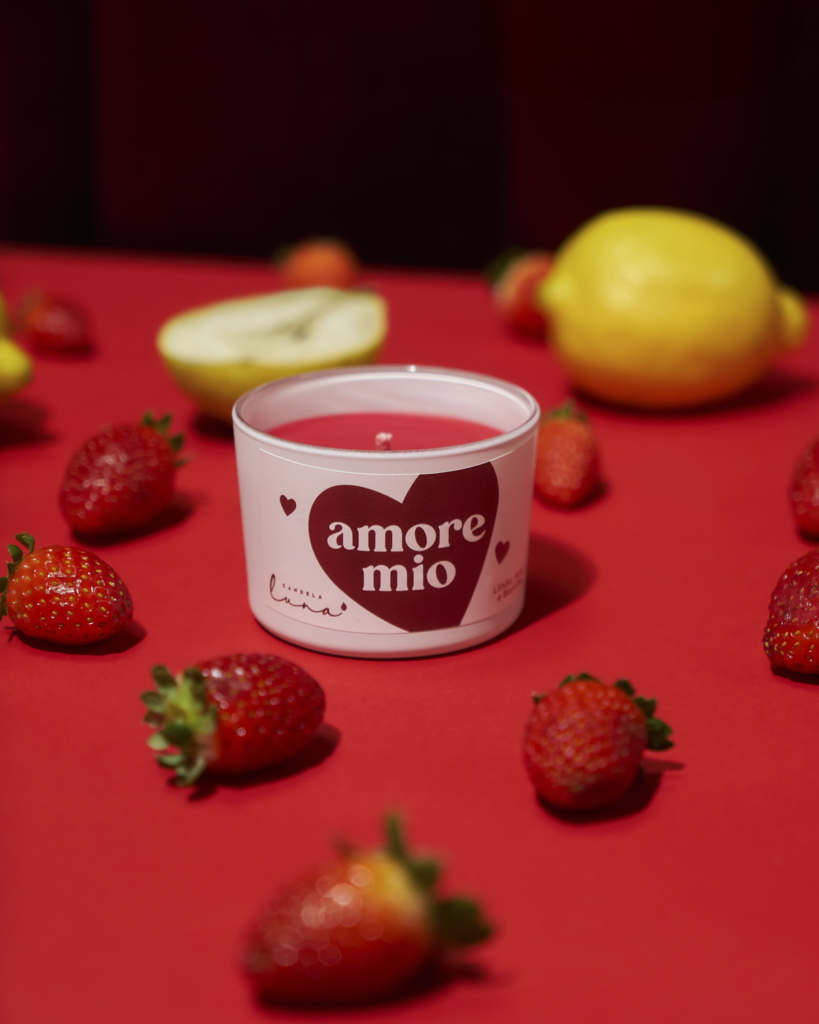 Criação de conceito, identidade visual e campanha para a vela Amore Mio da marca Candela Luna.